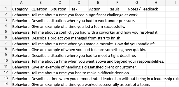 - After a mock interview, use the Notes / Feedback column to improve responses.